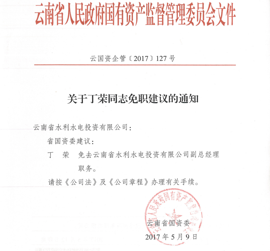 云南省國資委關于丁榮同志免職建議的通知